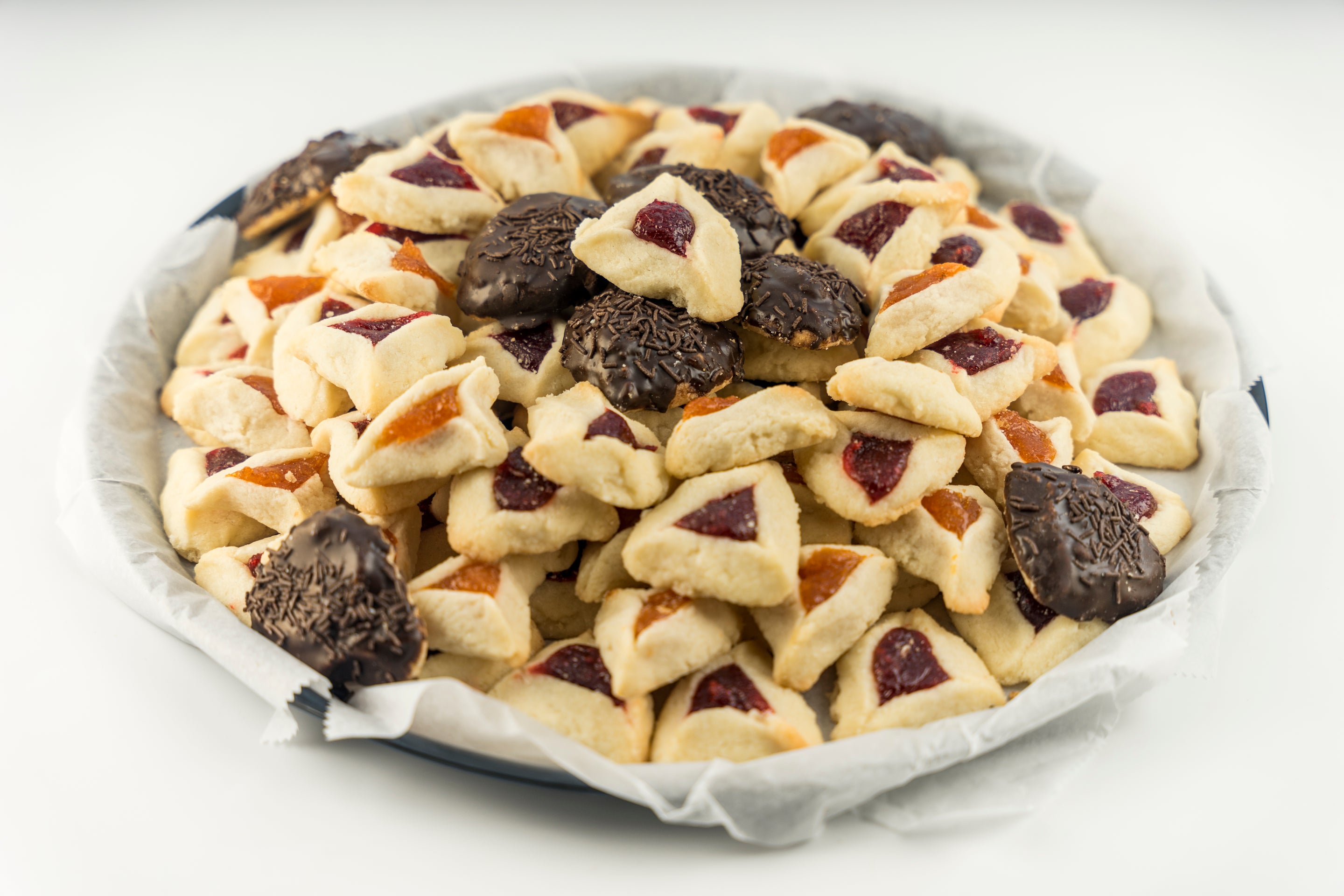 This 3 pound platter includes a variety of flavors such as poppy, chocolate, chocolate covered, apricot jam, and raspberry jelly. Perfect for sharing with friends and family. Wrapped in cellophane with festive ribbons. Please let us know if you'd like to include a personalized note to any of our baskets or gift tins.