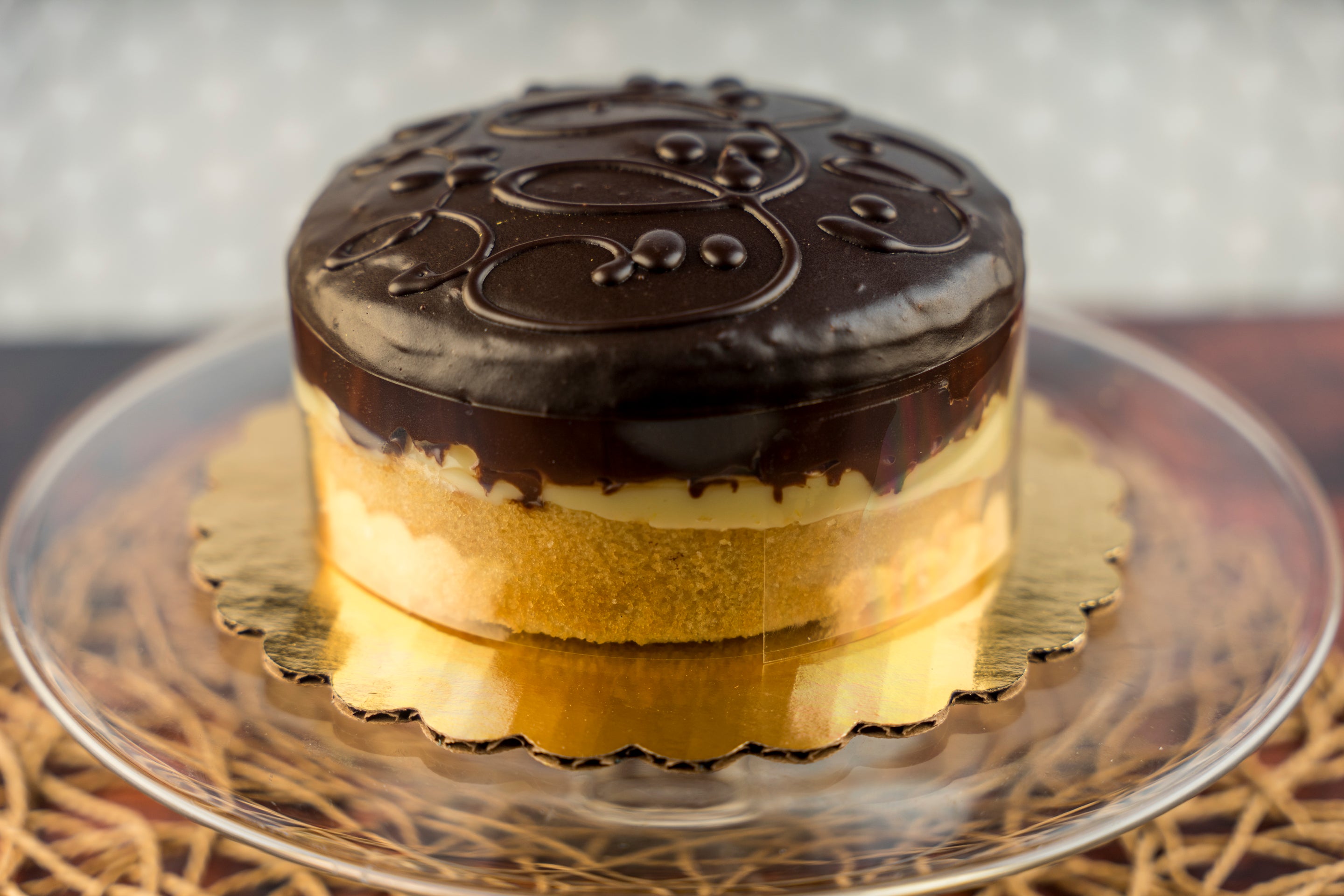 Our Boston Cream Layer cake, made with layers of moist yellow cake, filled with a creamy vanilla custard and topped with a chocolate glaze. A great combo in every single bite.