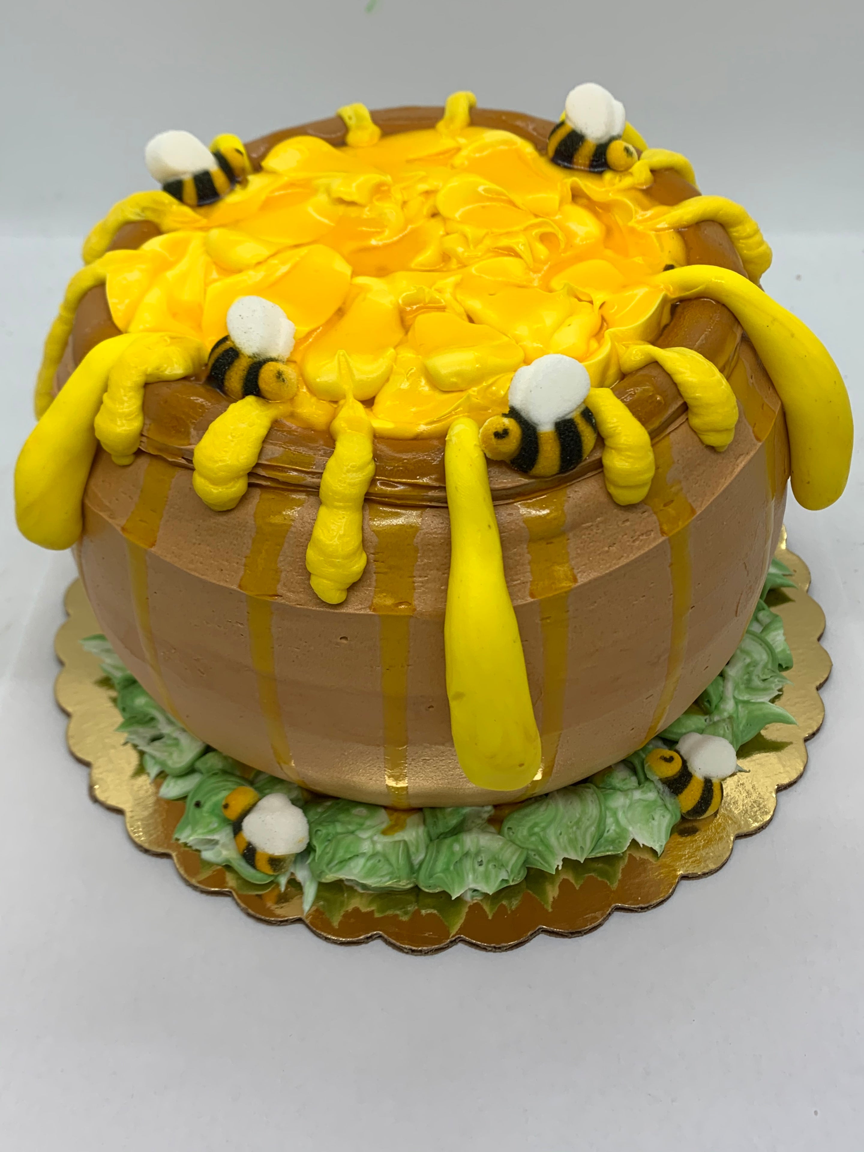 Serves approximately 8-12. Indulge in a heavenly fusion of classic flavors with our 8" Vanilla Honey Pot Cake. Layers of moist vanilla cake are filled with a creamy blend of honey and vanilla buttercream, making each bite a sweet and flavorful experience.