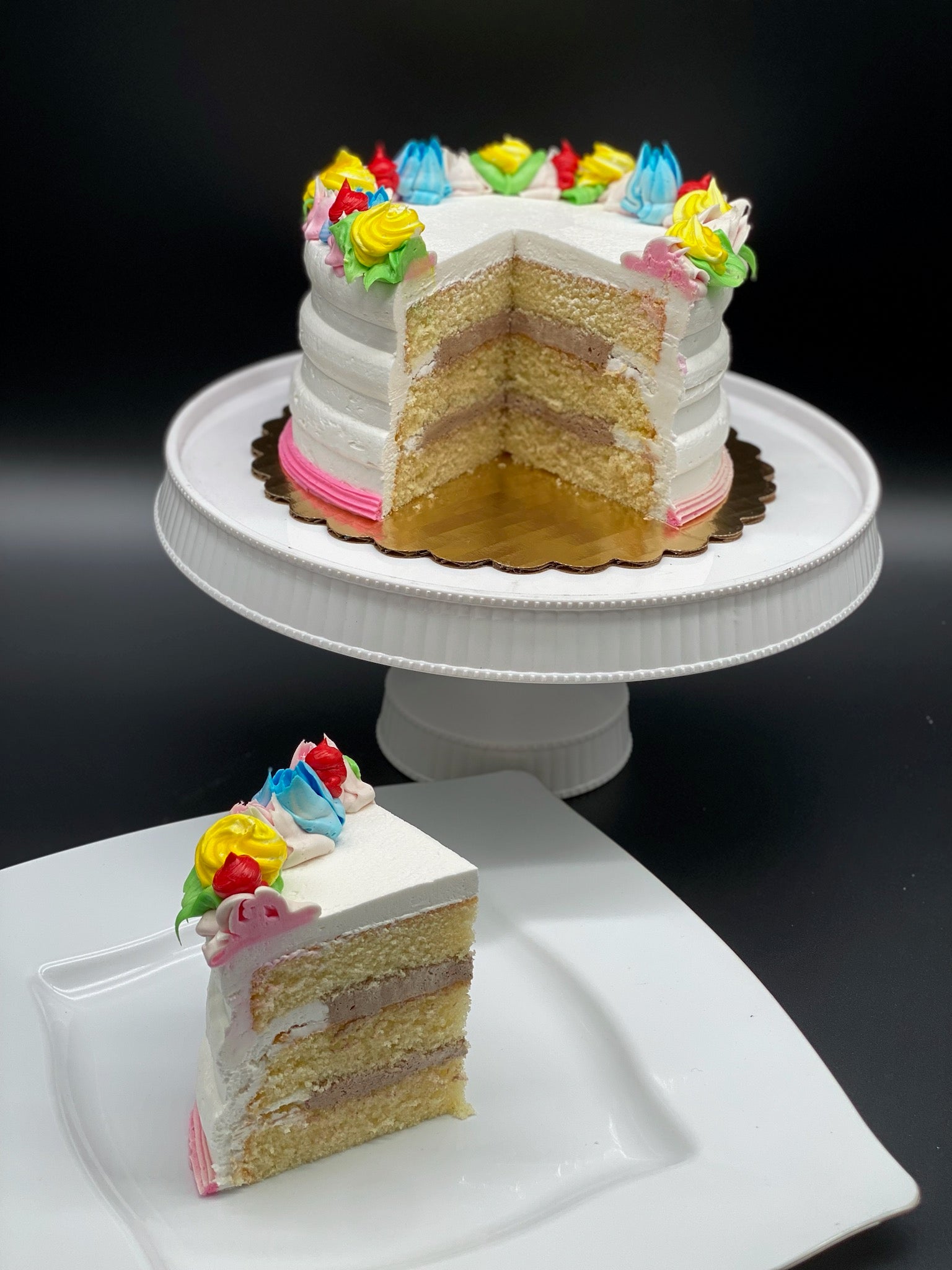Celebrate with our Flower Cake! Adorned with colorful buttercream flowers, this birthday cake has delicious layers of yellow cake and rich chocolate filling. Perfect for any occasion, this cake is sure to delight and bring a smile to your loved ones. Order now and make every celebration a little sweeter!