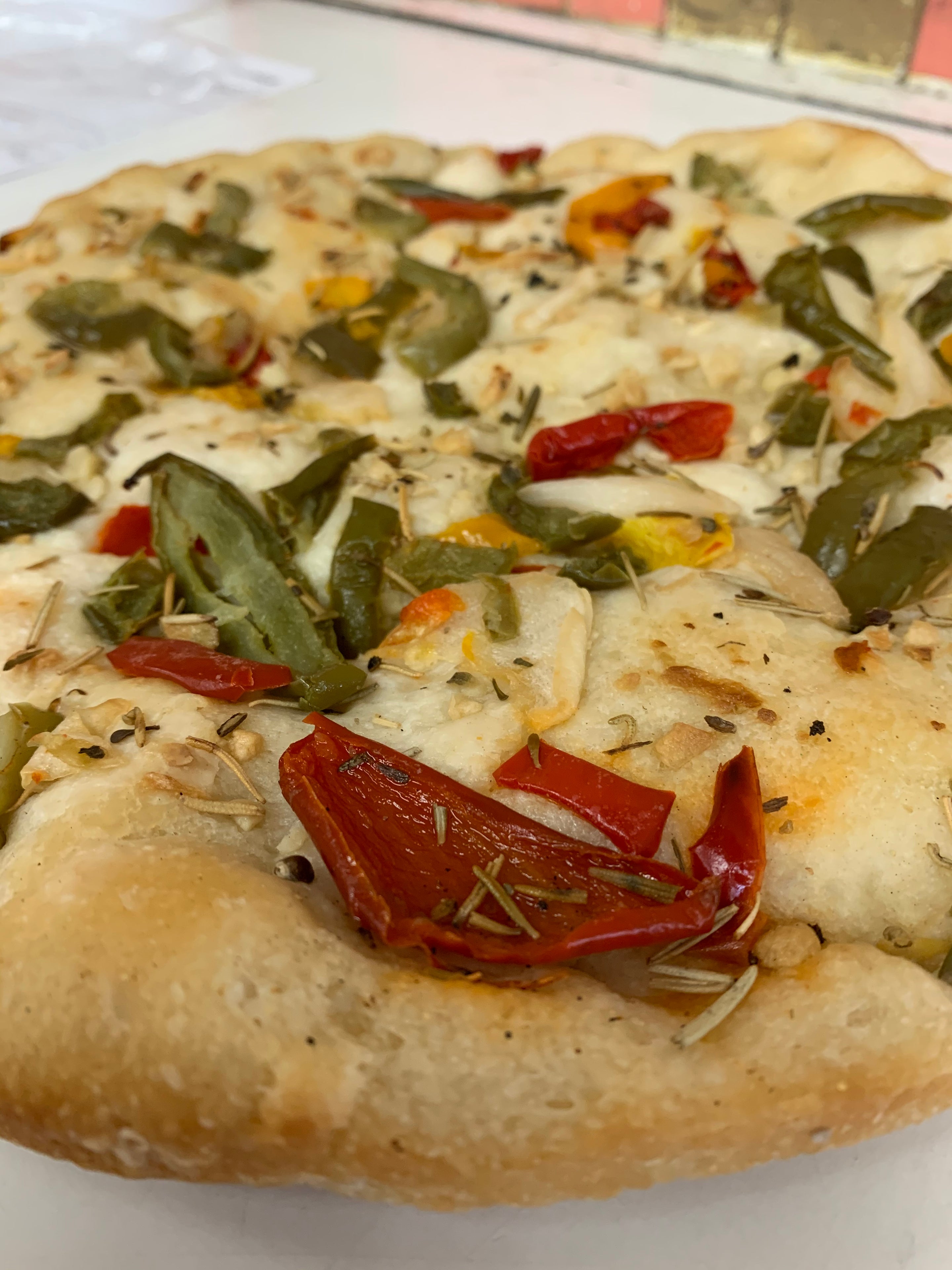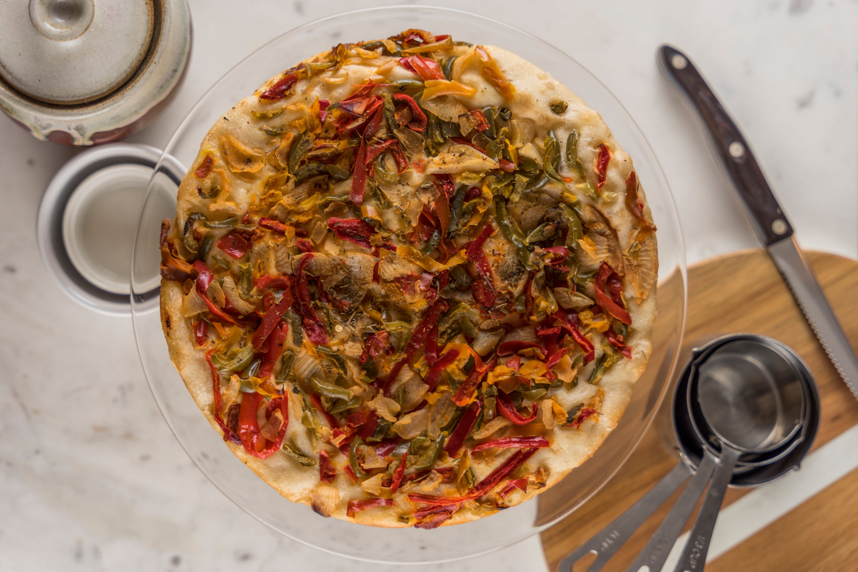 Tantalize your taste buds with our traditional, fluffy focaccia loaded with sweet peppers and onions. The perfect blend of bold flavors make this a treat you won't want to miss - try one today and make your taste buds sing!