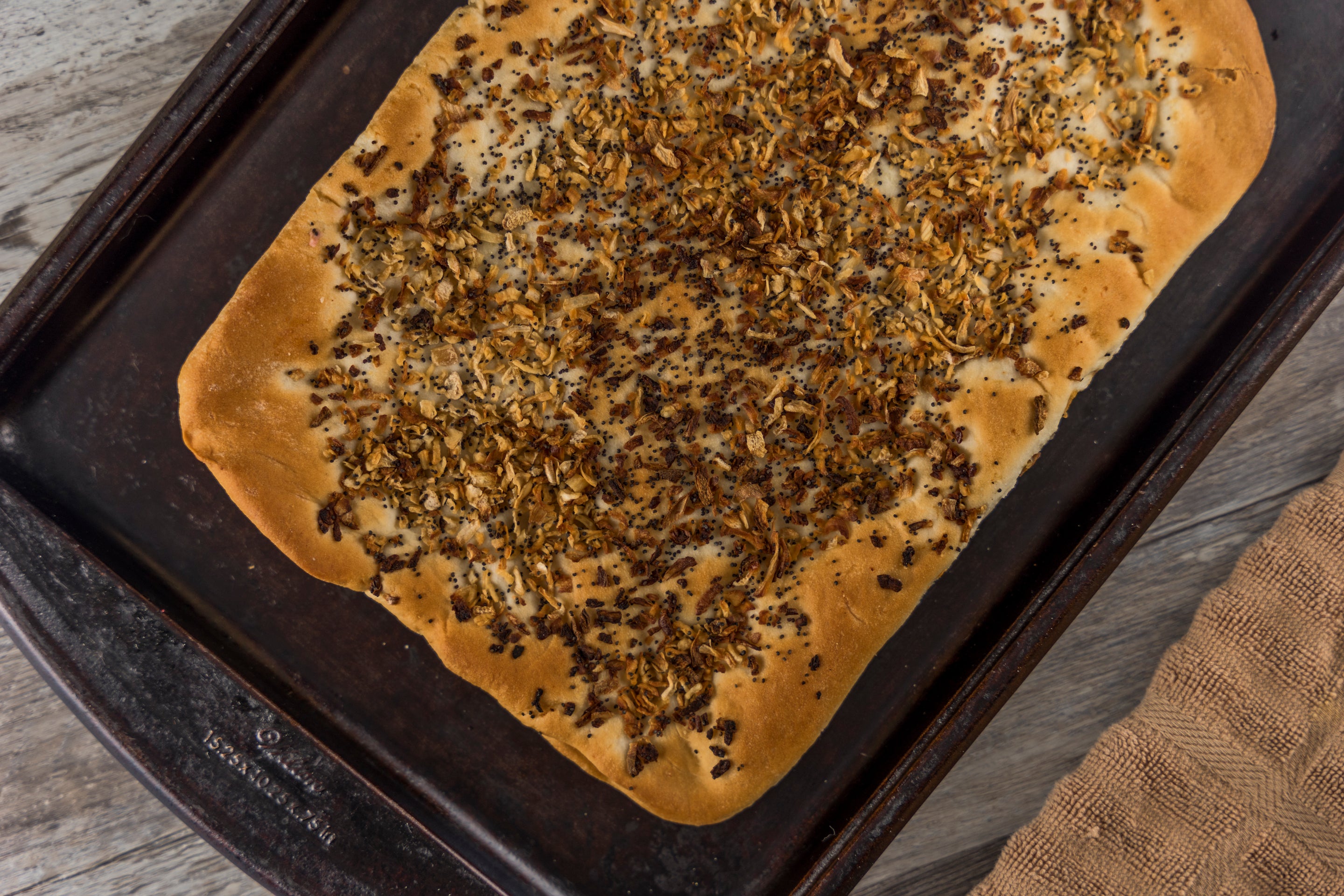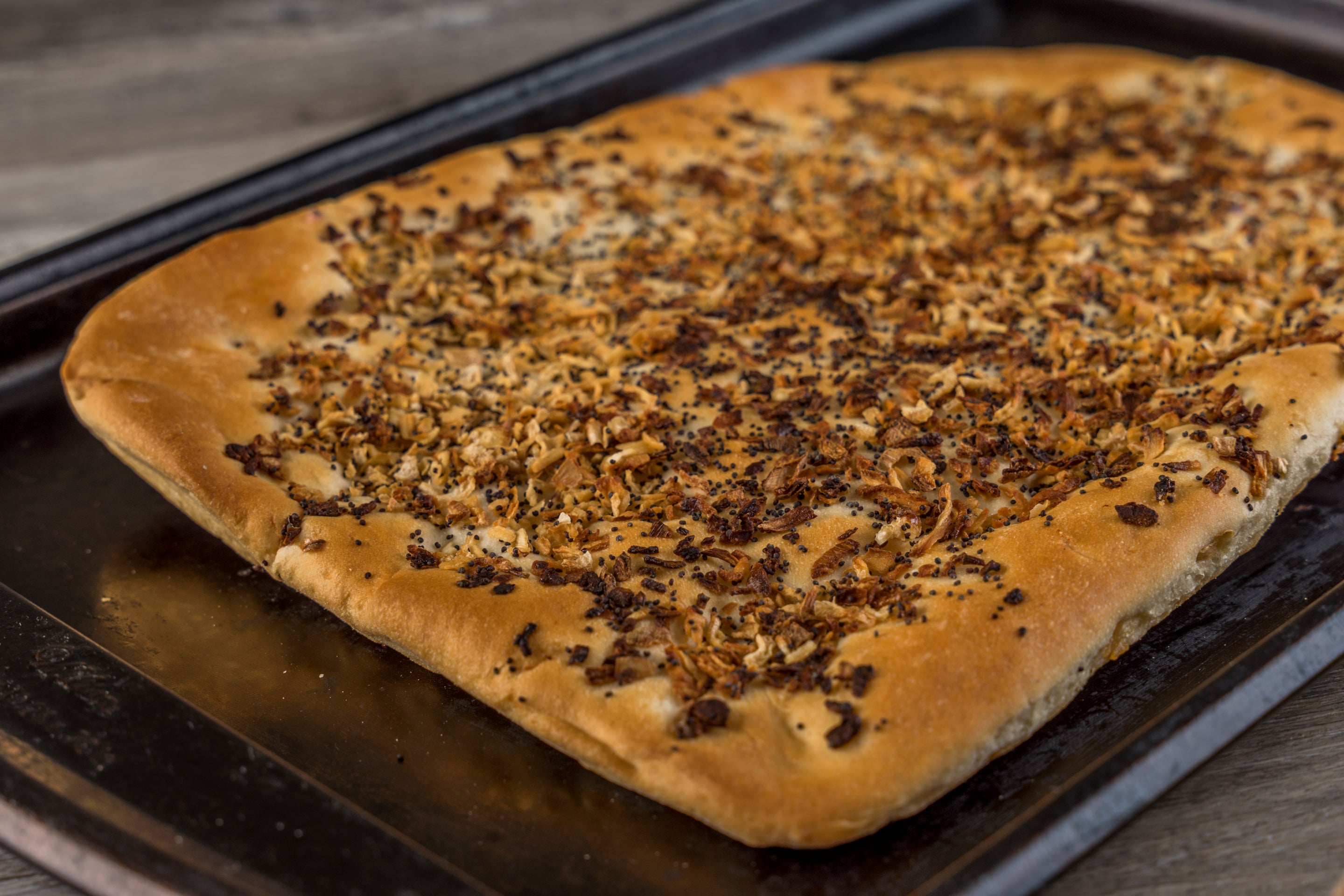 The pletzel can be traced back many centuries to the Jewish communities of Eastern Europe. It was an everyday staple, as the thin crispy flatbread required less time to rise than other breads. Covered with onions it became the perfect base for any type of spreads over its long history.