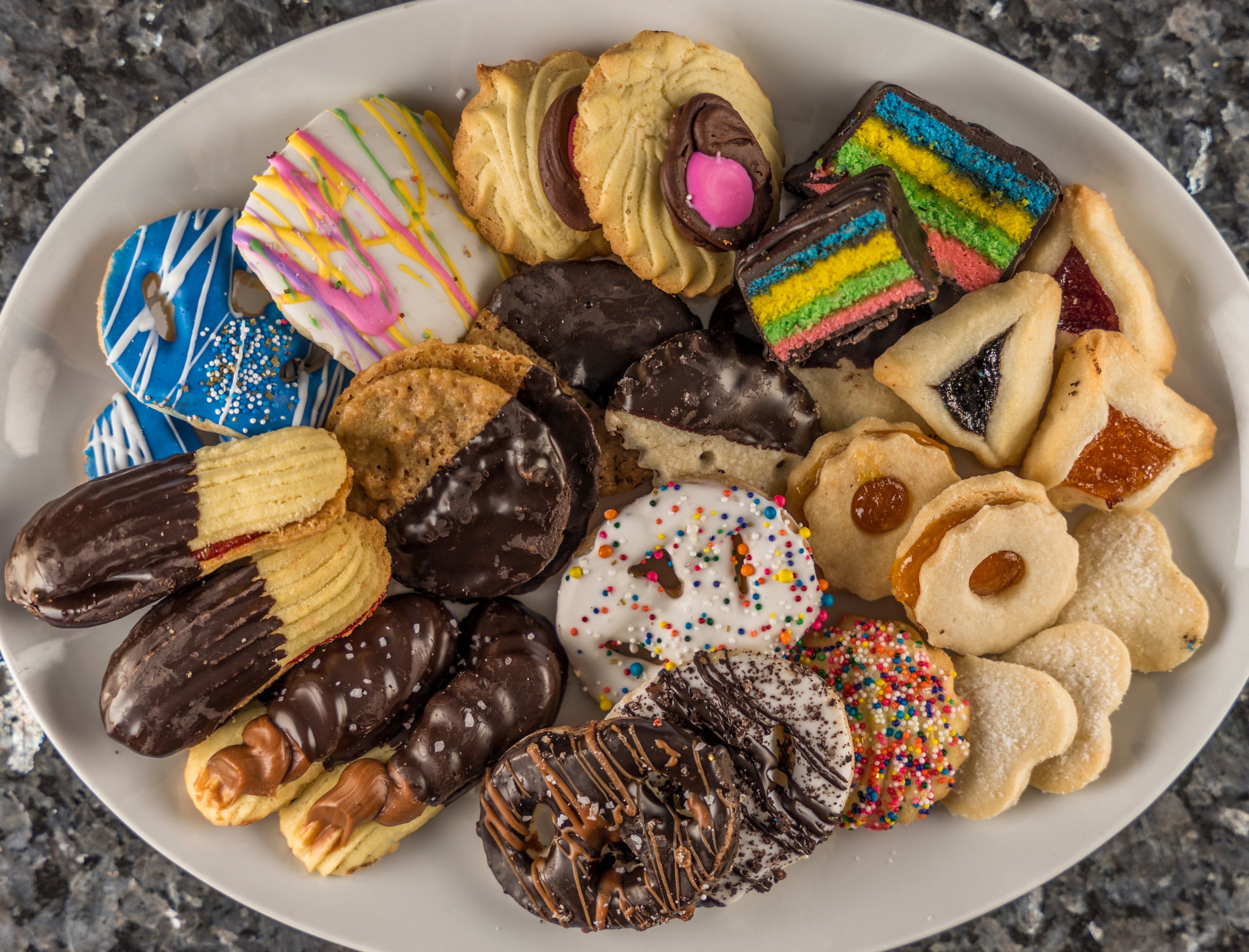 A delicious and diverse selection of old world bakery cookies. Enjoy a variety of flavors that will bring home childhood memories. Made with traditional recipes and the freshest ingredients. Varieties will vary depending on the day's production. Picture is serving suggestion. One of our best sellers!